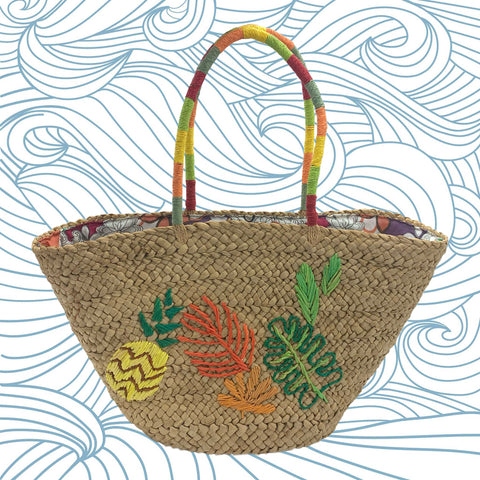 Borsa realizzata in paglia con chiusura a zip, con decorazioni colorate sul lato anteriore e con manici intrecciati e colorati. Molto spaziosa, all’interno è completamente foderata a motivi floreali e presenta una tasca con zip. Molto colorata e originale!